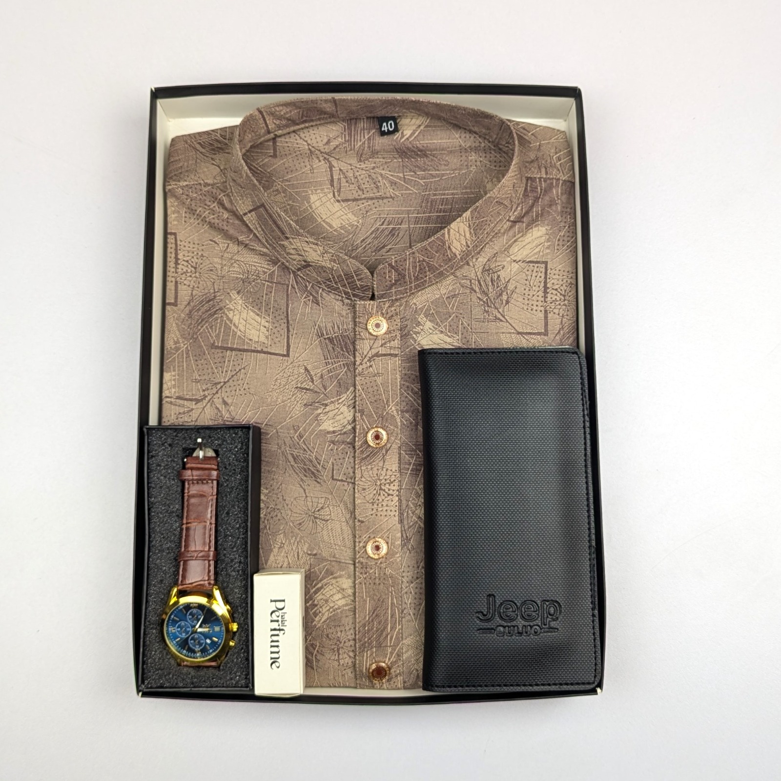 ওয়ালেট: Jeep Buluo ব্র্যান্ডের টেক্সচার্ড ব্ল্যাক লং ওয়ালেট, যা অত্যন্ত টেকসই এবং কার্ড ও টাকা গুছিয়ে রাখার জন্য বেশ সুবিধাজনক।