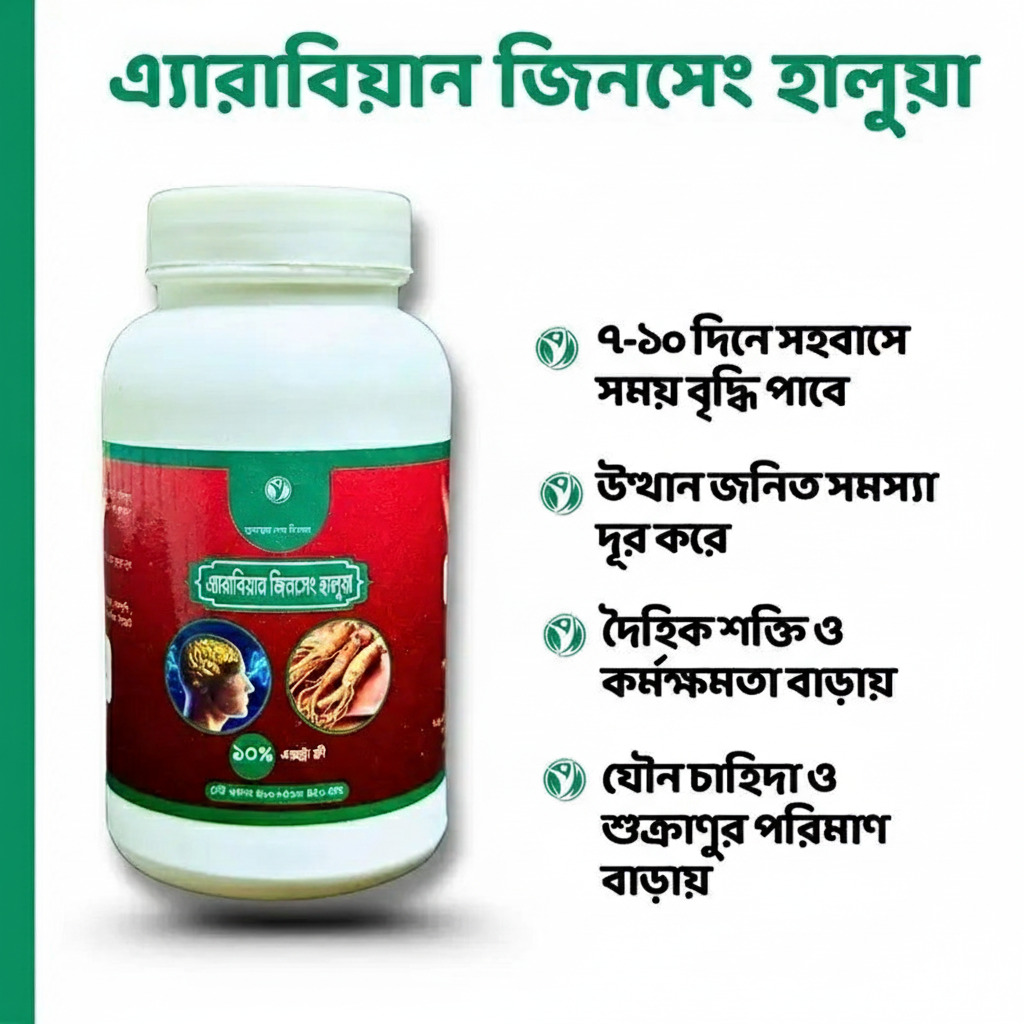 আপনি যদি পার্শ্বপ্রতিক্রিয়া ছাড়া প্রাকৃতিক উপায়ে আপনার শারীরিক শক্তি, স্ট্যামিনা এবং সামগ্রিক সক্ষমতা বাড়াতে চান, তাহলে “এ্যারাবিয়ান জিনসেং হালুয়া” আপনার জন্য একটি পরীক্ষিত এবং কার্যকর সমাধান।
