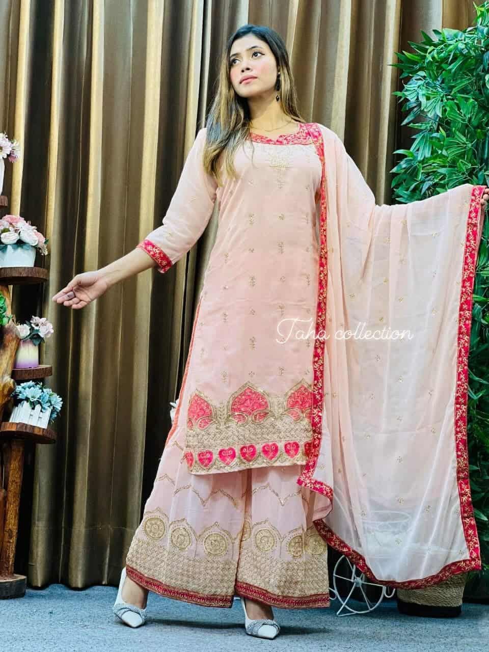 জামা: ইন্ডিয়ান জর্জেট ফ্যাব্রিকে তৈরি, সম্পূর্ণ সিকোয়েন্স এমব্রয়ডারি কাজ করা।