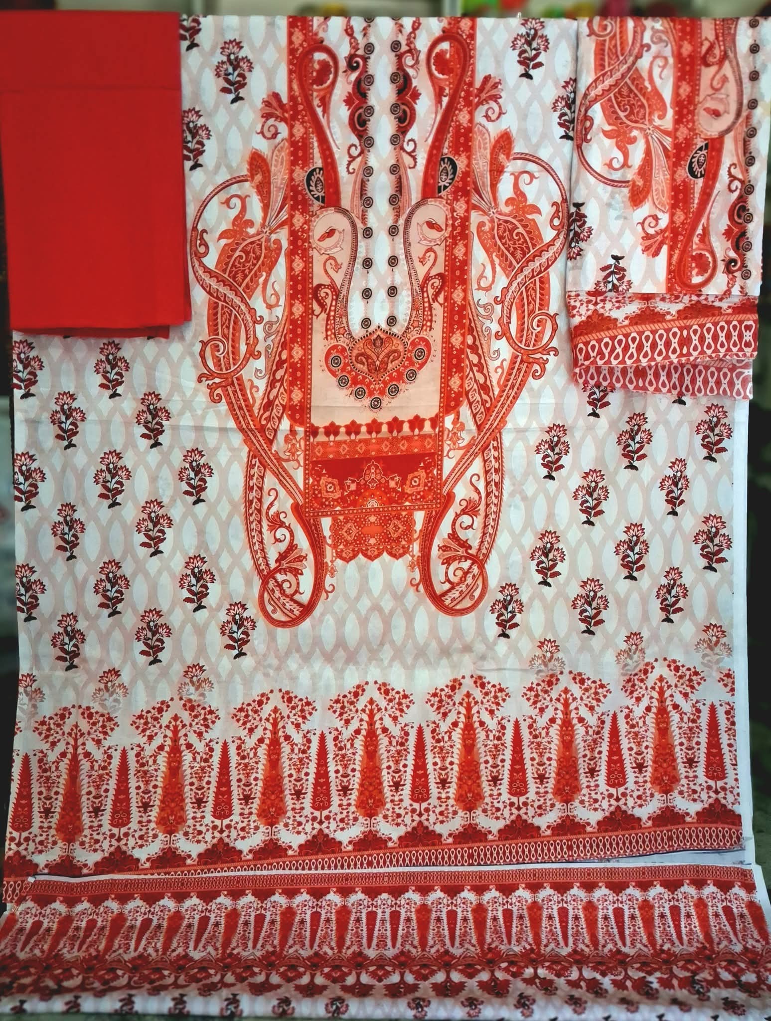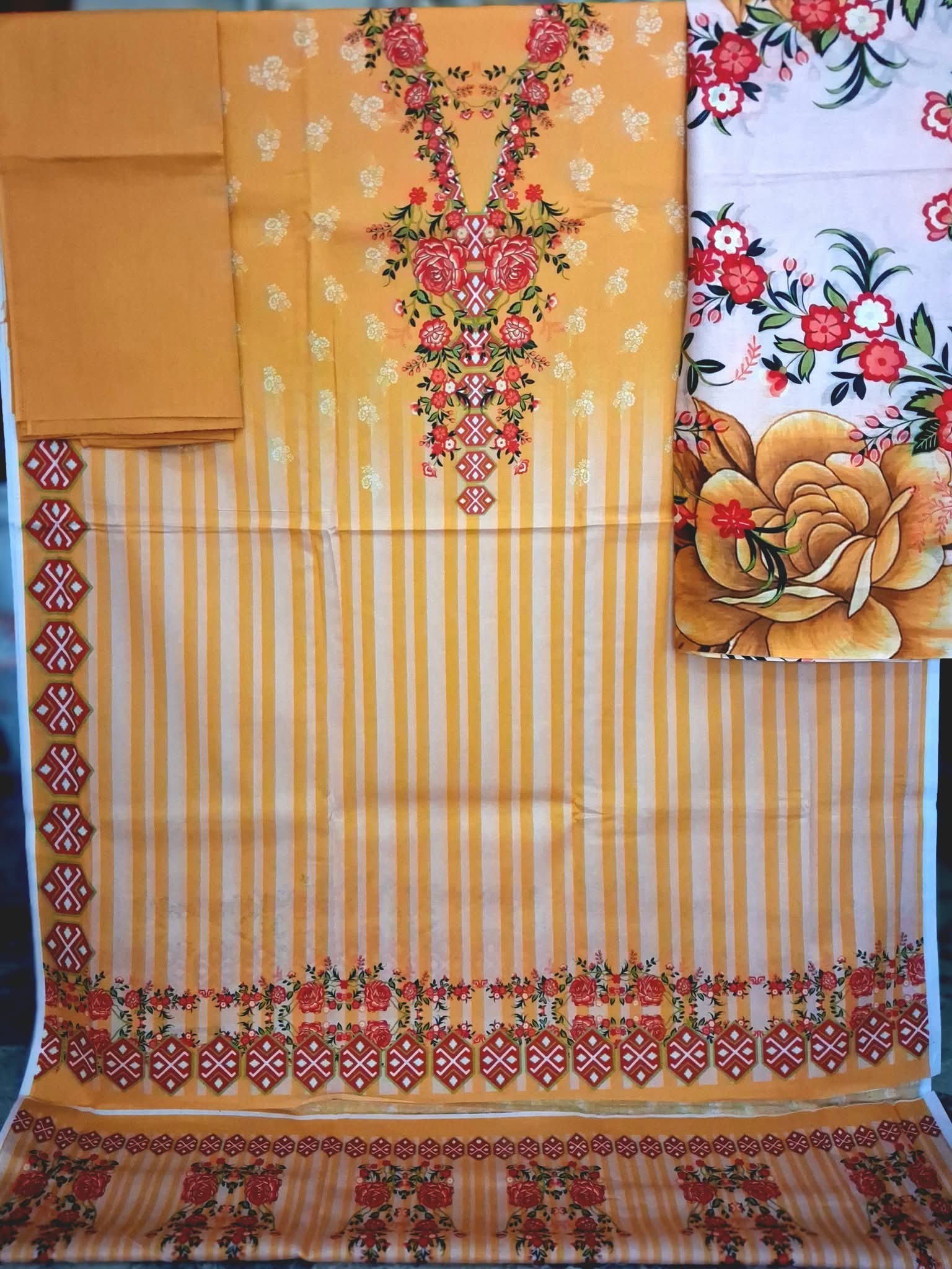 কালাম কারী সুতি কটন ফেব্রিকস এর মধ্যে থ্রি পিস জামা, সেলোয়ার-কামিজ + ওড়না এগুলো আরামদায়ক নরম এ গুলো নামাজি ওড়না