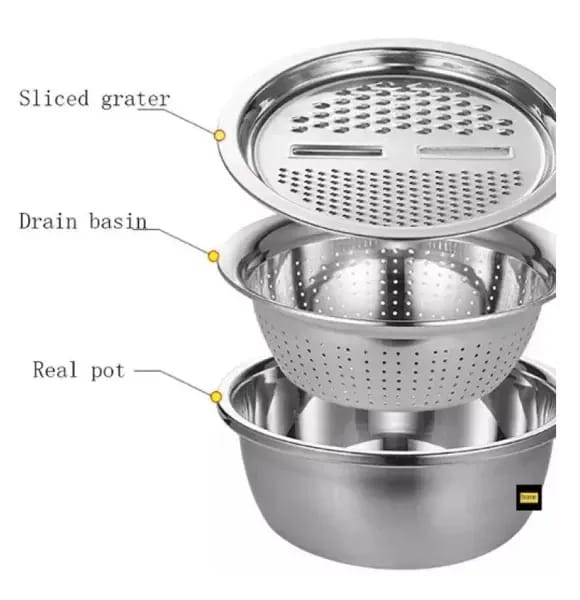 3 In 1 Multifunctional Stainless Steel Basin With Vegetable Cutter + Drain Basket.