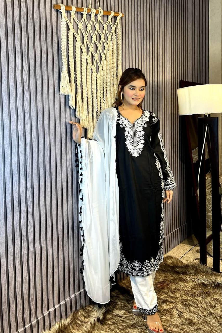 সুতি কাপড়ে এমব্রয়ডারি কাজ করা রেডিমেড থ্রী পিস।
