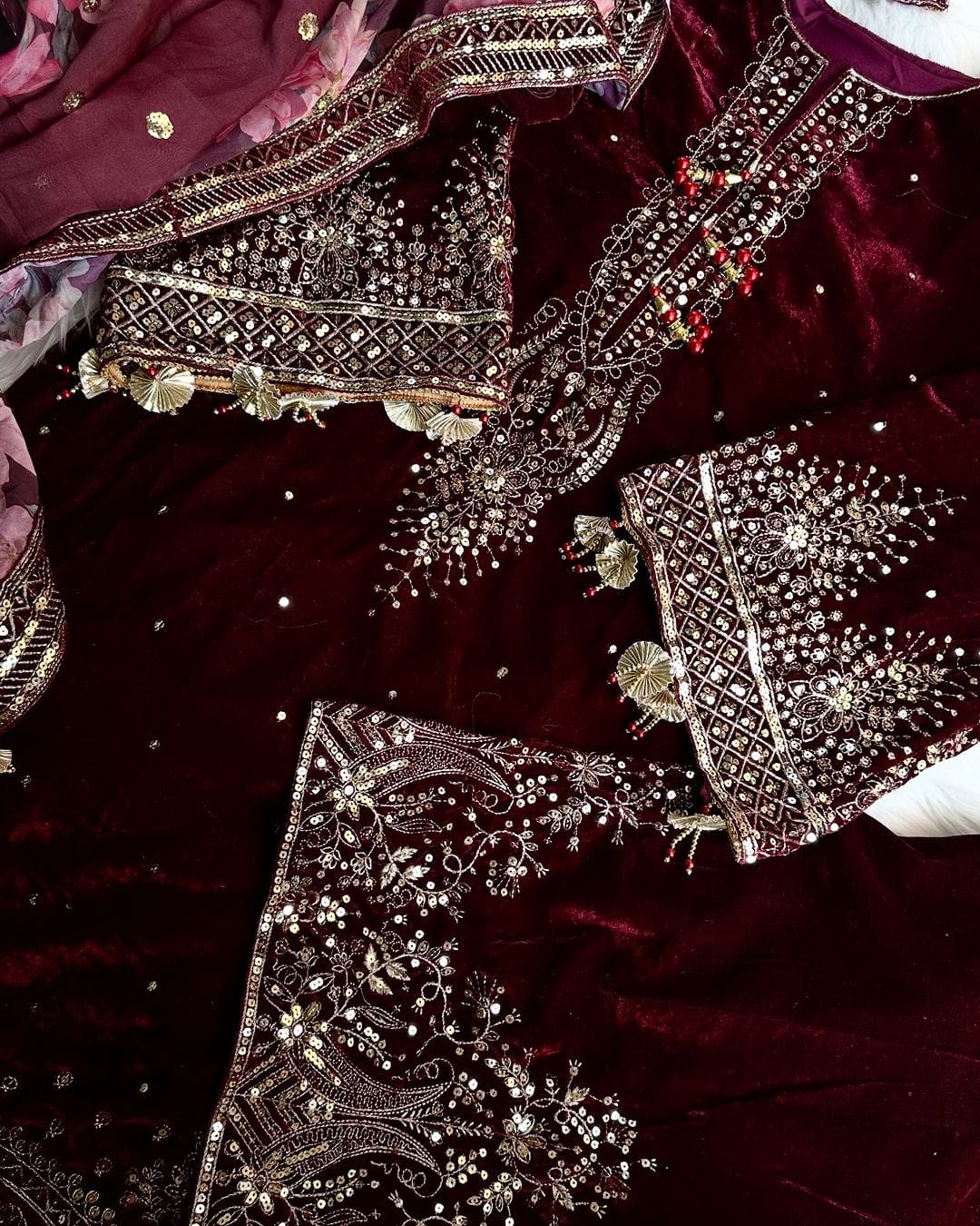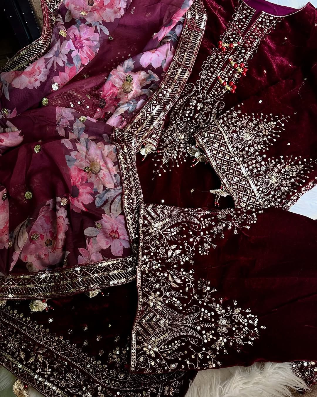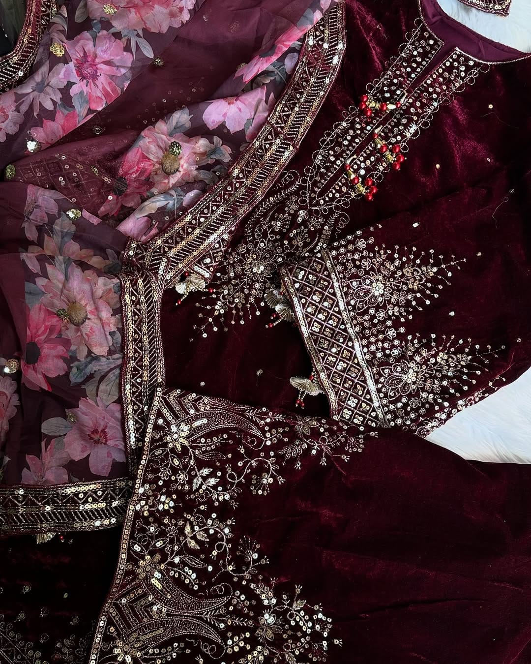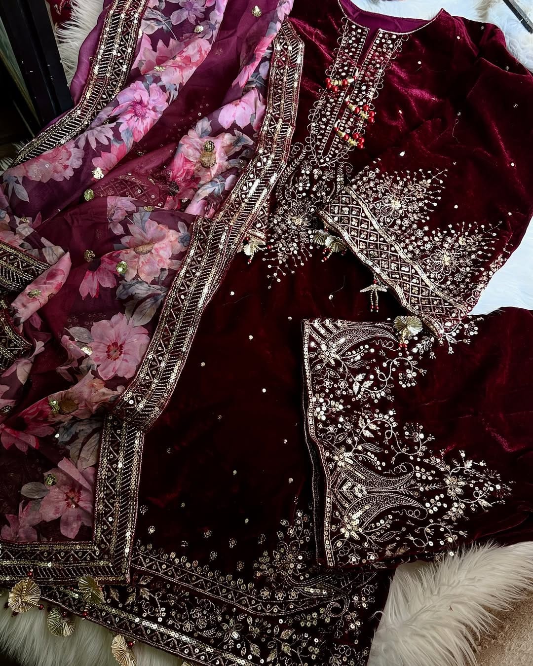 Get ready to turn heads with our exclusive Heavy Pure Viscose Velvet set! Featuring exquisite 5mm embroidery sequence work, fancy latkan details, and a luxurious soft feel, this collection is designed to make you stand out in style.